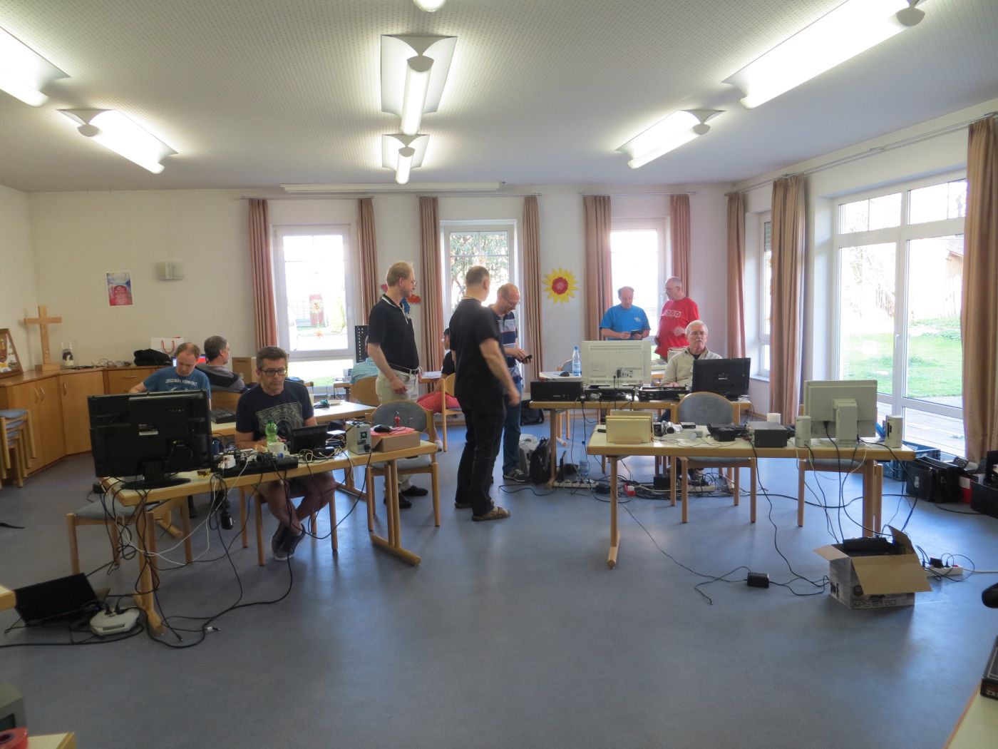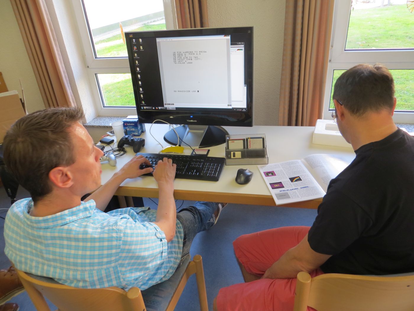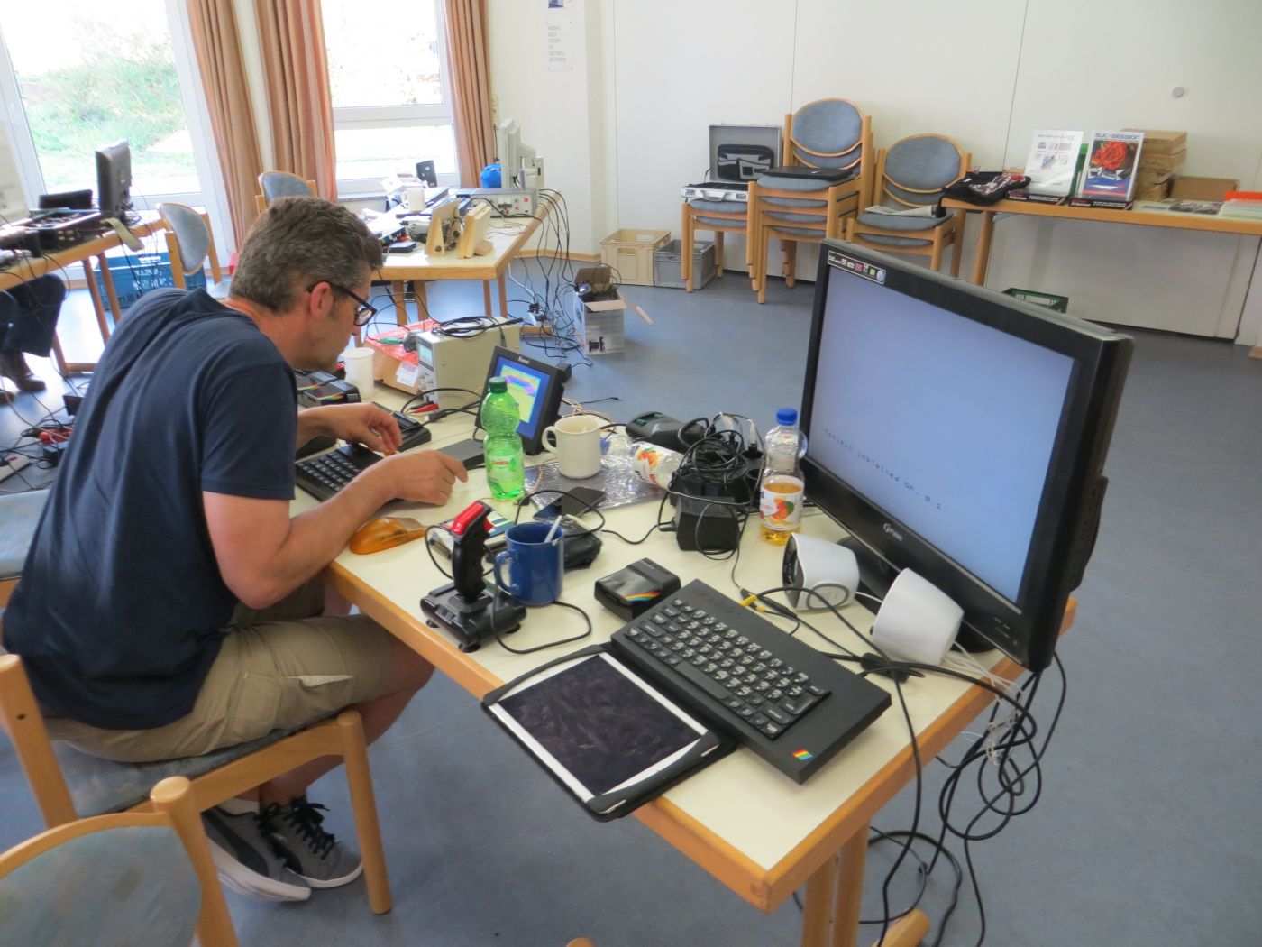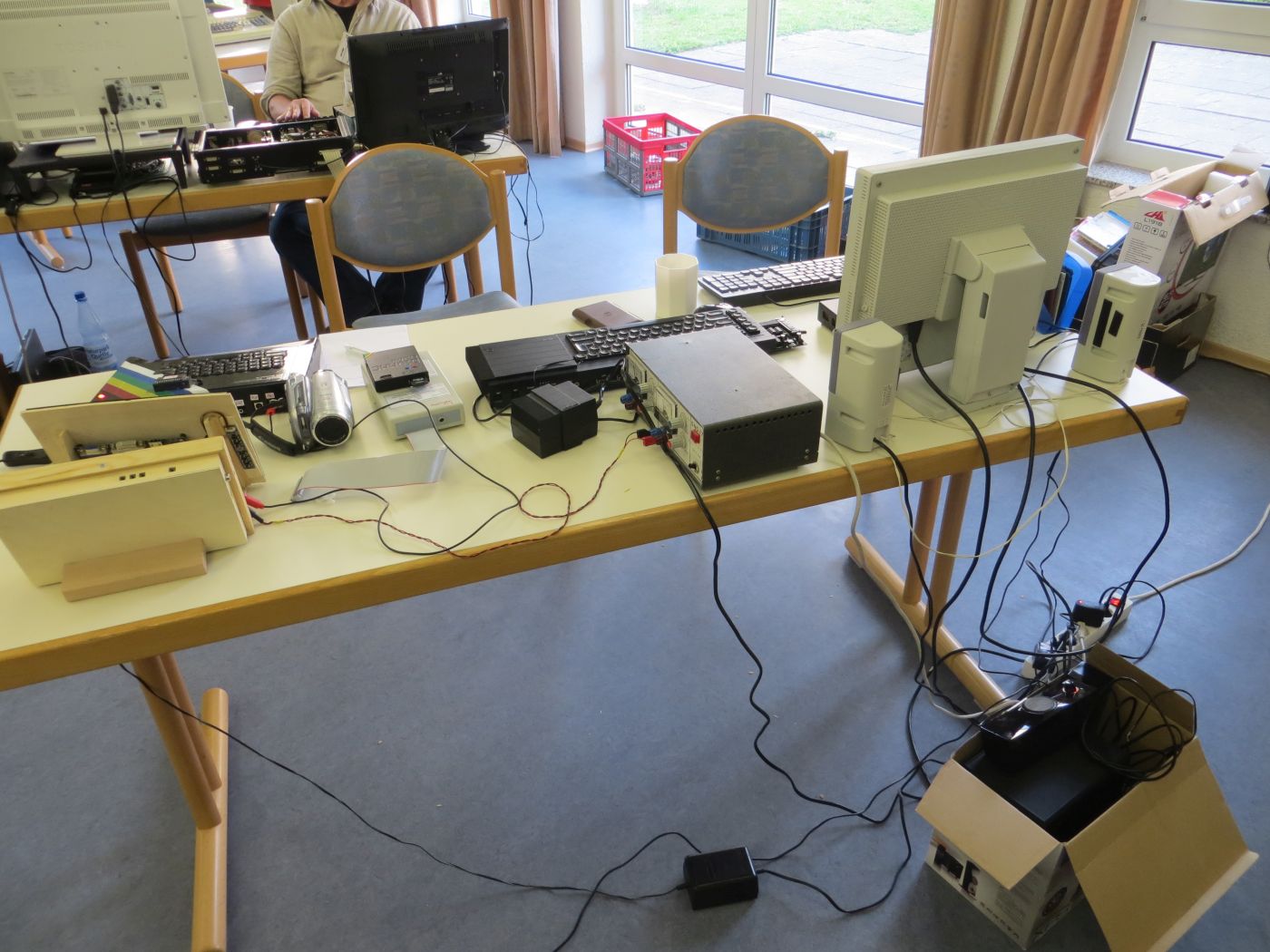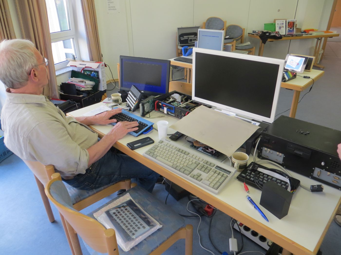 Am Samstag fanden sich dann ca. 12 Entusiasten im Gemeindehaus Johanneshaus ein – dazu kamen noch ein paar Tagesbesucher aus der Umgebung. Danach konnte den ganzen Tag getestet werden, Fachgespäche geführt und natürlich auch gespielt werden. Der langjährige Sinclair-Spezialist Thomas Eberle von Sintech war auch vor Ort und hat etwas Sinclair Hard- und Software zum Verkauf angeboten.