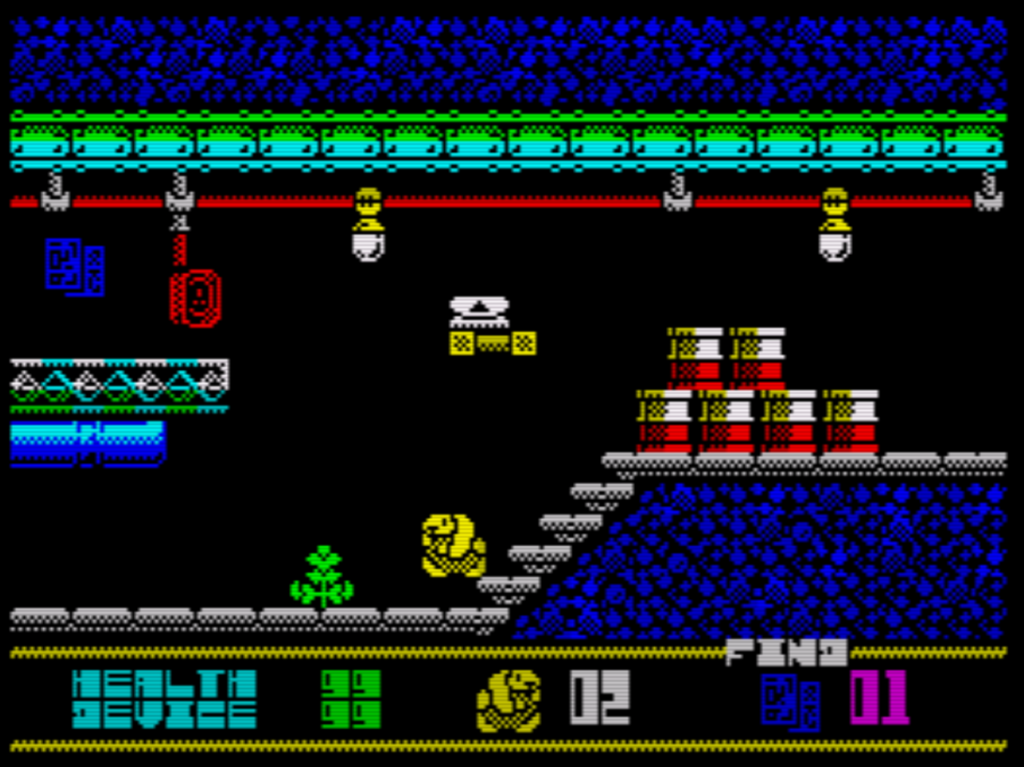 Sobald der erste Teil abgeschlossen ist, geht es weiter mit dem zweiten Teil, der in der unterirdischen Basis stattfindet. Wenn der erste Teil 25 Bildschirme umfasste, so ist dieser mit 26 Bildschirmen sogar noch größer. Der Unterschied in den Szenarien ist nicht groß, aber anstatt den Weg unzählige Male zu gehen, genügt nun ein einziger Durchgang. Dies liegt daran, dass das Ziel darin besteht, 33 Blaupausen zu finden, die an verschiedenen Orten innerhalb der Basis versteckt sind. Es ist nicht notwendig, alle zu finden, um den zweiten Teil abzuschließen, aber es ist erforderlich, alle Orte aufzusuchen, um sicherzustellen, dass keine Pläne übersehen werden und man nicht mit leeren Händen am letzten Bildschirm ankommt. Um das Gefühl eines Arcade-Abenteuers aufrechtzuerhalten, hat der Entwickler viele Rätsel in die Bildschirme integriert. Um an einige der Pläne zu gelangen, müssen Sie die verschiedenen Elemente der Szenerie korrekt anordnen. Die elastischen Betten sind unverzichtbar, um höher gelegene Bereiche zu erreichen, und die Fässer dienen nicht nur dazu, Gegner umzuwerfen. Außerdem gibt es noch ein besonderes Rätsel, das an den Klassiker Thunderbirds von Grandslam erinnert. Versuchen Sie es zu finden…