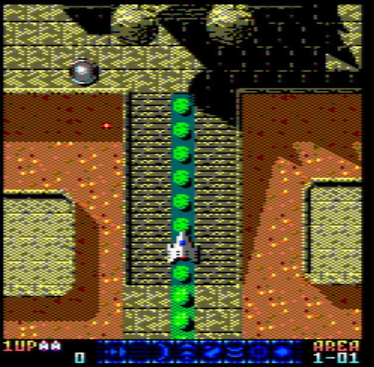 Leider ist der Schwierigkeitsgrad selbst in der leichten Version schon ziemlich hoch. Die anfänglich verfügbare Waffe ist ziemlich schwach und die Power-Ups sind kaum hilfreich. Immerhin gibt es genügend Leben und Credits, und das Checkpoint-System ist überwiegend fair. Die Grafik von Alcon 2020 gehört wohl zum Besten, was 8-Bit-Shooter zu bieten haben, mit kräftigen Farben, flüssigen Animationen und scharf gezeichneten Sprites. Der Soundtrack ist kraftvoll und bietet mit dem PlayCity-AddOn ein beeindruckendes 6-Kanal-Audioerlebnis.