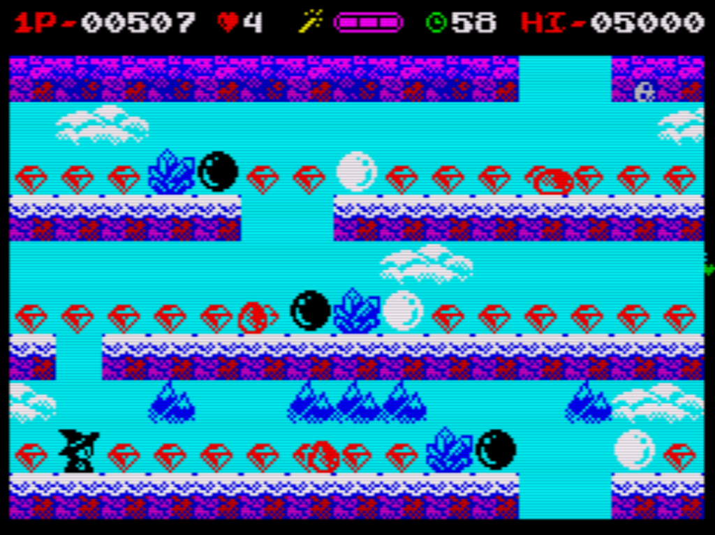 Das nächste Übel: einige der Fundorte der Diamanten. Obwohl sie Hexen sind, können Candel and Alice nicht fliegen, vor allem, weil sie ihren Besen nicht zur Hand haben. Aber sie können mit einer Mechanik, die der von Bubble Bobble sehr ähnlich ist, ausgesprochen sanft gleiten. Um also einige der Diamanten am oberen Bildschirmrand zu erreichen, müssen Sie von unten fallen. Das Problem ist, genau die Stelle zu treffen, an der man fällt, vor allem, wenn auf den Wegen die Feinde patrouillieren.