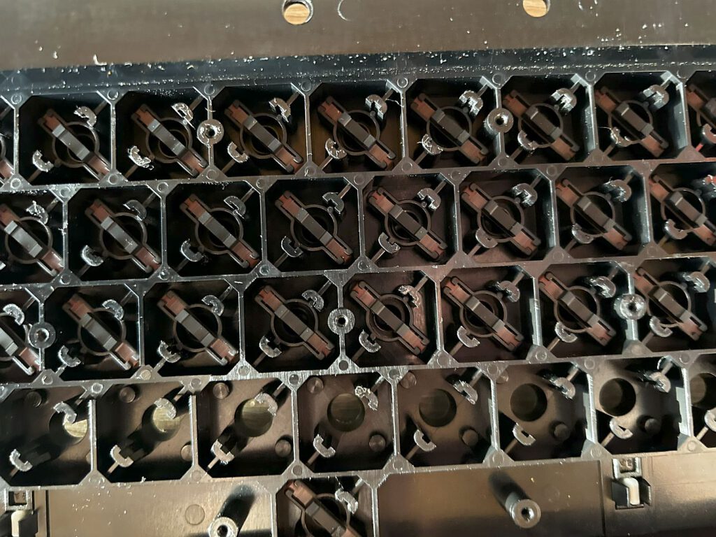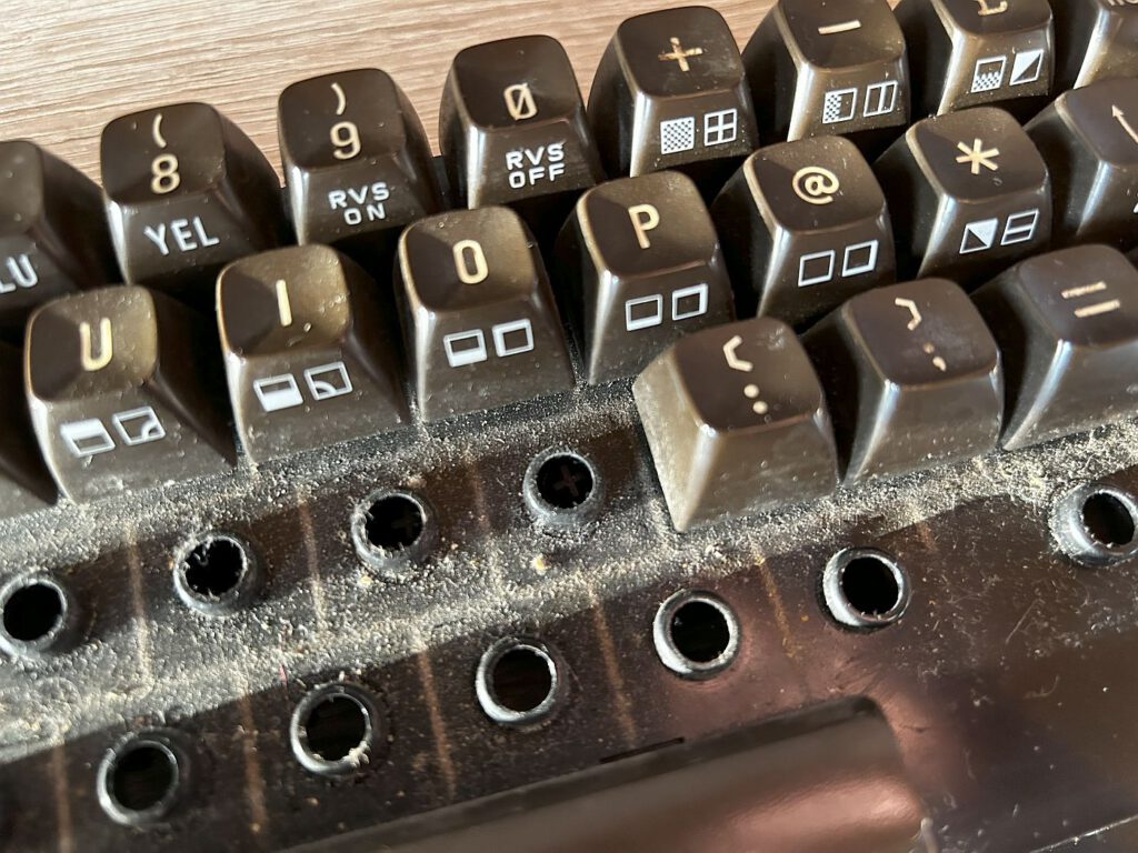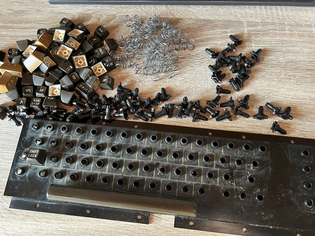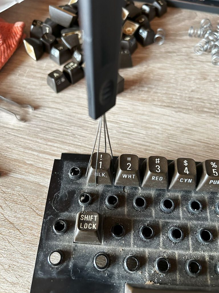 Also entschied ich mich für den letzten mir verbleibenden Versuch – ich demontierte die Tastatur. Zuerst mussten einige Schrauben gelöst und die beiden Drähte der Shift-Lock-Taste abgelötet werden. Anschließend entfernte ich viele kleine Schrauben, um die Platine zu lösen. Ich reinigte die Platine mit Isopropanol und zog mit einem praktischen Werkzeug, dem Tastenkappen-Abzieher von Amazon, die Tasten ab. Diese reinigte ich in einer milden Seifenlauge und die Kontaktstifte säuberte ich wieder mit Alkohol. Nach dem Trocknen begann ich mit dem Zusammenbau in umgekehrter Reihenfolge. Ergebnis: Die Tastatur funktionierte wieder! 🙂