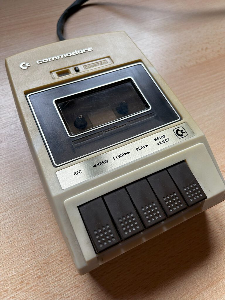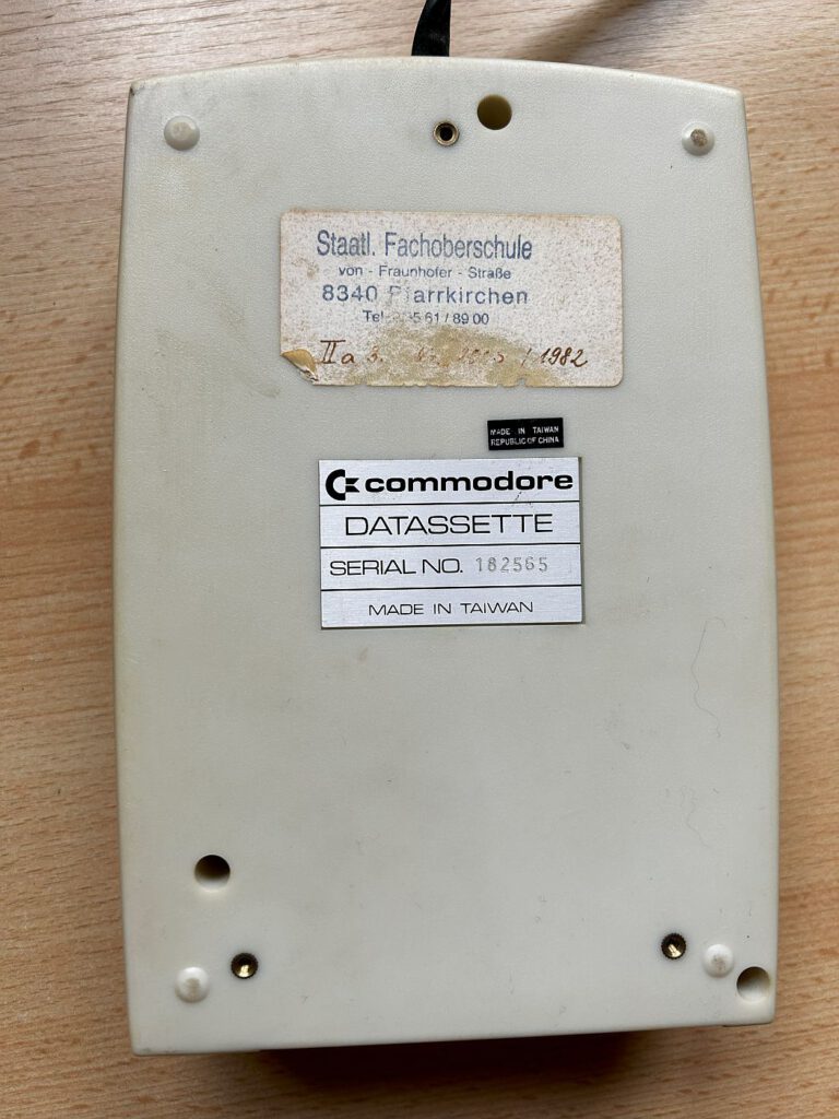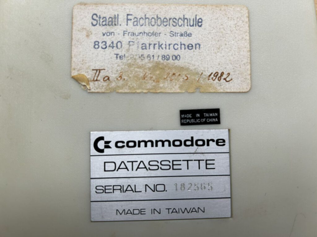 Als Zubehör erhielt ich auch eine Datasette, die auf der Unterseite einen Aufkleber der Fachoberschule Pfarrkirchen trägt. Es handelt sich um das Modell C2N, das als externes Gerät für die PET/CBM-Reihe eingeführt wurde. Diese ist funktional identisch mit der Datasette 1530 und kann auch mit VC20, C64 und C128 verwendet werden.