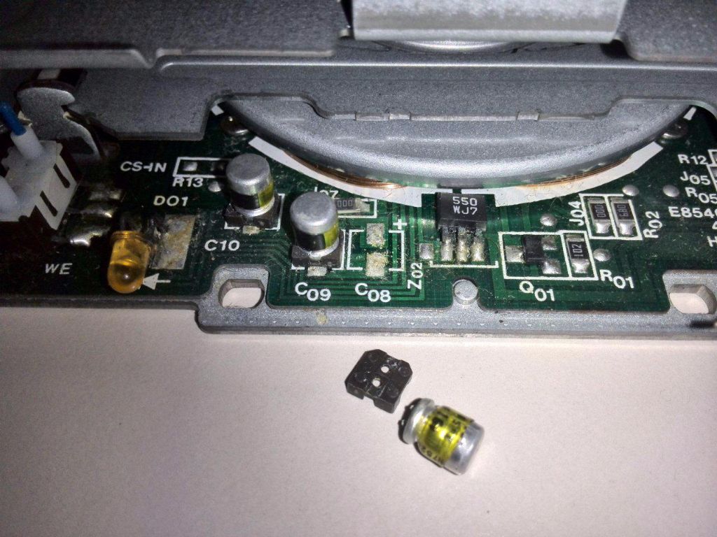| Hier sieht man die gesamte Motorsteuerungsplatine mit den entfernten Elkos. Was für eine, auf Bayrisch gesagte „Sauerei“! Hier müssen alle Lötpads und auch rundherum die Kontakte mit Kontakt WL gereinigt werden, damit das Elektrolyt neutralisiert wird, dann müssen alle Kontakte entlötet und neu verzinnt werden. | Hier ser ihr den schönen „Laufwerks-Hack“ mit total übertriebenen und neuen 105° low ESR Elkos, in liegender Bauweise. So braucht man keine SMD Elkos und kann normale Elkos verwenden. Durch die Dicke der Elkos gibt es auch kein Problem – der untere Laufwerksschlitten hat keine Reibestellen an den Elkos. Zu beachten ist, dass die Polarität wie auf der Platine gekennzeichnet ist passt, ansonsten kann ein falsch gepolter Elko platzen, und das wollen wir nicht 🙂 |