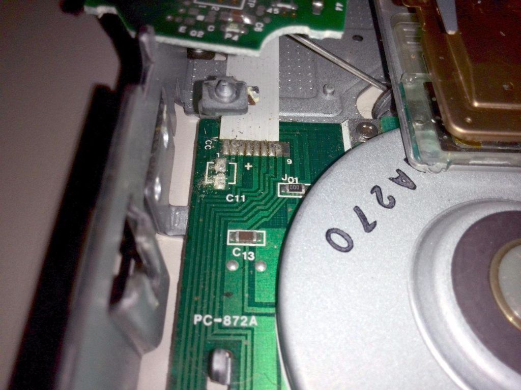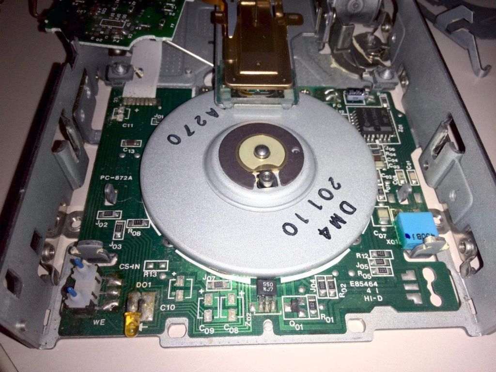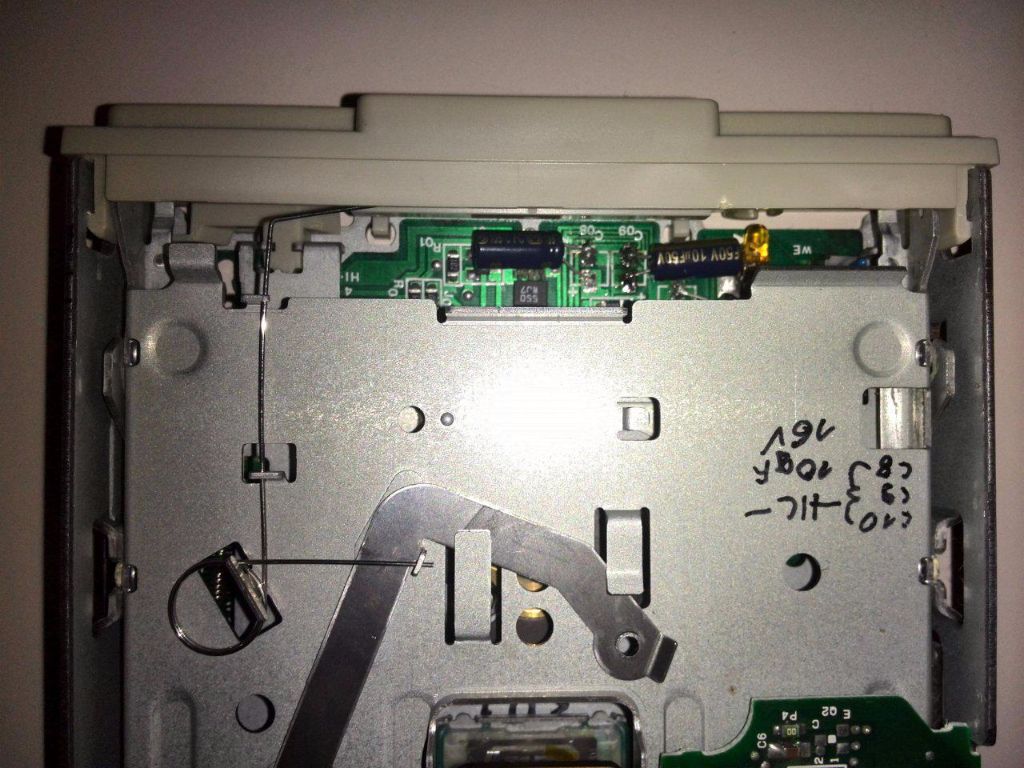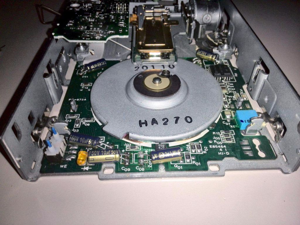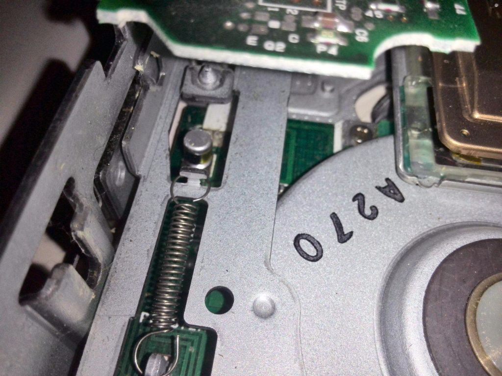 Bei dieser „Retro“ Reparatur setze ich Kenntnisse beim Zerlegen von Laufwerken voraus. Besonders die Federn für die Auswurfmechanik können für einen ungeübten zum Haare ausreißen führen 🙂 Die zwei Federn für den Schlitten unten sind kein Problem aber die Feder für den oberen Schlitten, was sich links hinten befindet, treibt einen schon in den Wahnsinn, wenn man einen gewissen Trick nicht kennt.