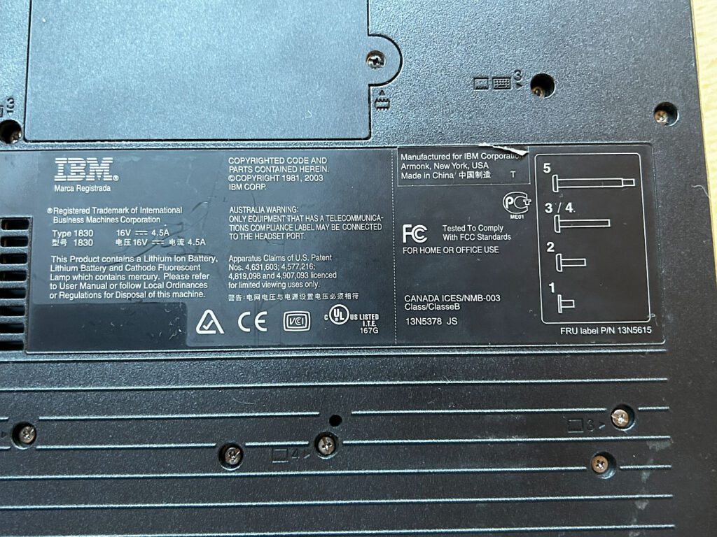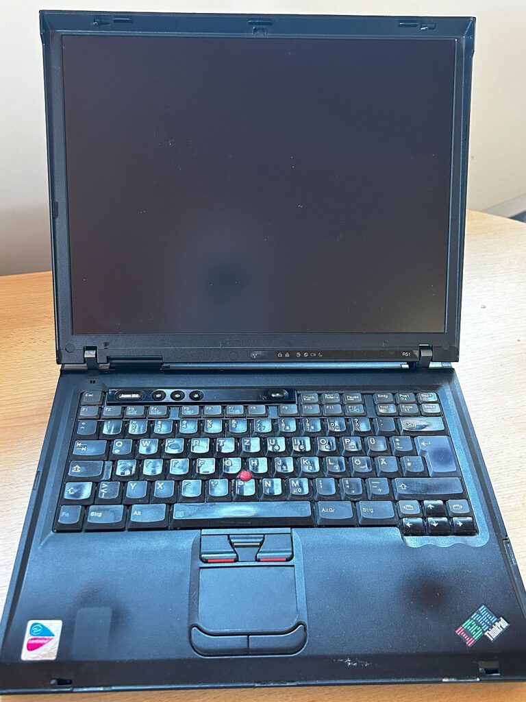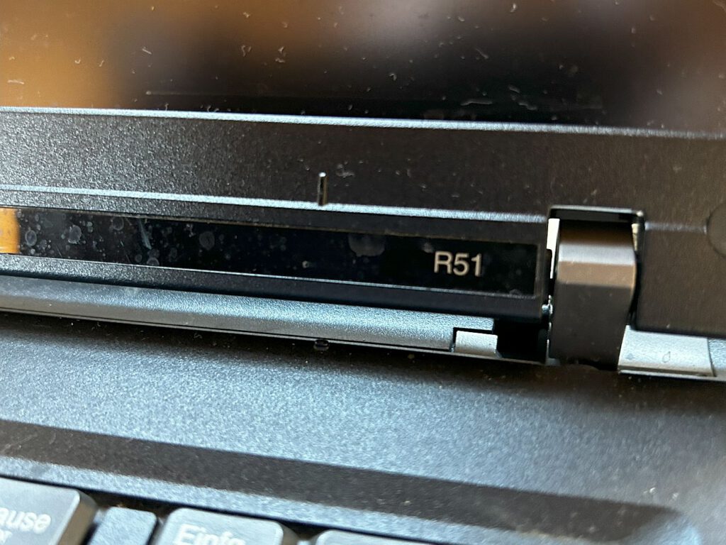 Das R51 ist das zweite Modell der R5x-Serie und wurde von April 2004 bis Februar 2007 produziert. Es verfügt über einen Intel Celeron M oder Pentium M Prozessor mit 1,3 bis 1,8 GHz, 256 oder 512 MB Speicher und eine Grafikkarte, die entweder eine Intel Extreme Graphics 2 oder eine ATI Mobility Radeon 7500 (16 MB) oder Radeon 9000 (32 MB) sein kann. Das Gerät bietet zahlreiche Anschlüsse: auf der linken Seite 2 x USB, S-Video, Netzwerk, Modem, Kopfhörer, Mikrofon, Firewire und 2 x PCMCIA. Auf der rechten Seite befindet sich das CD-Laufwerk und ein VGA-Anschluss, während auf der Rückseite ein Parallel-Anschluss zu finden ist. Mein Gerät ist mit 512 MB Speicher, einem Pentium M 1,7 GHz Prozessor und einer ATI Radeon 9000 Grafikkarte ausgestattet. Als Betriebssystem läuft Windows XP, und die Festplatte hat einen Speicherplatz von 32 GB.
