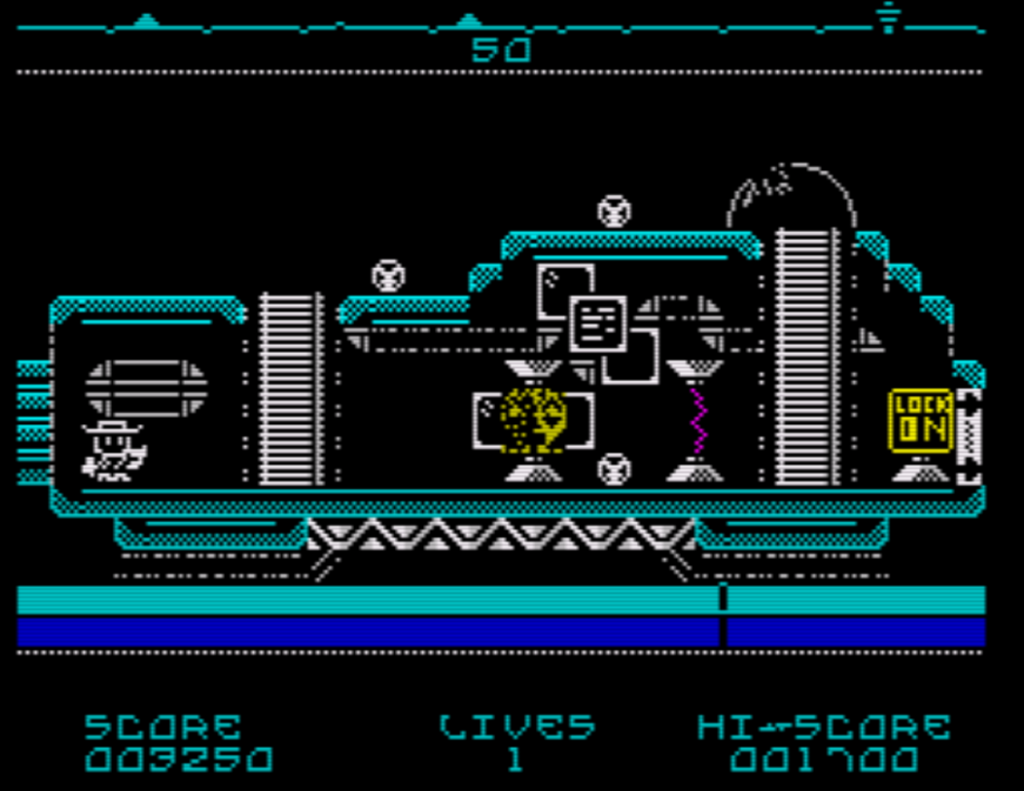 Und obwohl das Thema eher bodenständig ist, wurde das Weltraumelement nicht vergessen. Wie bereits erwähnt, übernimmt man die Rolle eines Weltraumcowboys, der eine Reihe von Bösewichten und schließlich die KI in der Maschinenhalle besiegen muss. Es gibt 64 Bildschirme, 32 für jeden Teil von „Last Train to Tranz-Central“, über acht Level hinweg. Jeder Zug hat 8 Bildschirme, es gibt auch acht „Bosse“, die es zu besiegen gilt. Diese sind viel schwieriger zu erledigen als die anderen Schurken, da sie nicht nur viele Schüsse aushalten, sondern auch auf einen schießen, nachdem sie selbst einiges an Blei abbekommen haben. Außerdem sind sie normalerweise nicht ungeschützt und haben ihre eigenen privaten „Bodyguards“, die ebenfalls keine Skrupel haben, gegen den Spieler vorzugehen.