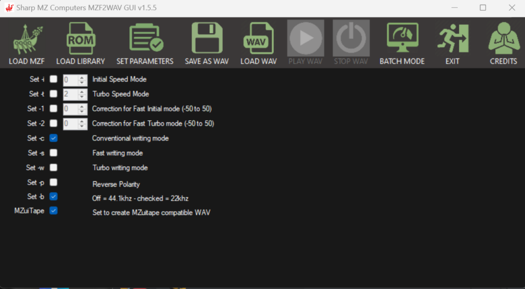 Der Entwickler des MZuiTape hat mit dem Entwickler von MZF2WAV zusammengearbeitet, um es mit einer grafischen Benutzeroberfläche ein wenig zu modernisieren. Dazu wurde eine Funktion hinzugefügt, die es ermöglicht, WAV-Dateien mit 22 kHz zu erstellen. Es ist wichtig in der Software unter »Set Parameters« folgende Optionen zu markieren, damit die WAV-Dateien auch sicher funktionieren:
