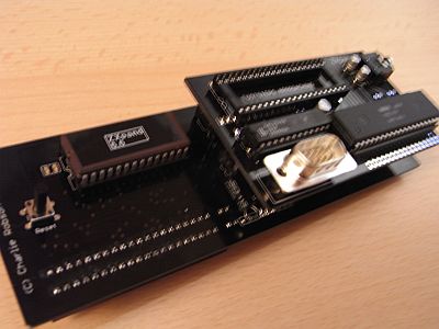 Danach passt das ZXpand-AY Modul genau in die nun freien Sockel. Der vorher entfernte Hauptprozessor muss nun in den freien Sockel auf dem ZXpand-AY eingesetzt werden (dort wo „Footsteps Approaching“ steht ). Die Markierung auf dem Prozessor muss auf der dem Lautsprecher-Anschluss abgewandten Seite sein.
