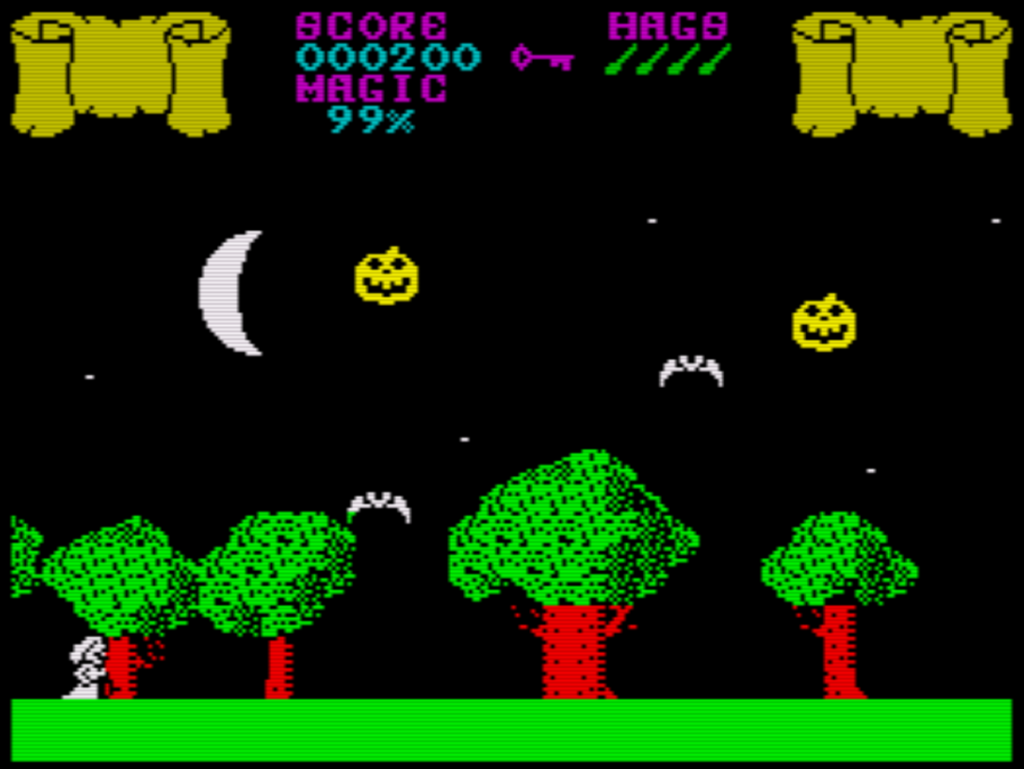 The Witch ist ein echtes Remake, und zwar von einem der Spectrum-Klassiker, Cauldron aus dem Jahr 1985. Wobei ich nicht ganz verstehe, was dieses Spiel zu einem Klassiker macht. Ich vermute aber, dass es etwas mit dem Thema und der Grafik zu tun hatte, die für die damalige Zeit recht ansprechend war. Am Gameplay lag es sicher nicht, denn meiner Meinung nach hatte das Original in dieser Hinsicht einige Mängel: Immer wenn die Hexe die Höhlen betrat, verlor sie ihre Fähigkeit zu fliegen und konnte nur noch laufen und springen, allerdings nur langsam, was vor allem dazu führte, dass sie vielen Feinden nicht ausweichen konnte. Um ehrlich zu sein, war The Cauldron meiner Meinung nach ein mittelmäßiges Spiel (genau wie die Fortsetzung), aber ich habe Respekt vor dem Mut des Entwicklers, ein Spiel mit diesen Eigenschaften in Angriff zu nehmen.