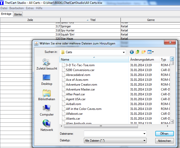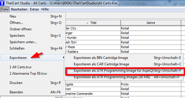 Folgende Dateiformate können hinzugefügt werden: – CAR – BIN – ROM – ATR. Die anderen Dateiformate – XEX and COM – können auf dem Weg über das Maxflash Cartridge Studio oder das Megacart Studio eingebunden werden. Außerdem können auch Cartridges die komplett für das 2MB Flash MegaCart erstellt wurden (Generiere 2MB Dateien) erwendet werden. Dort wird beim Export eine CAR-Datei erstellt. Diese kann hier einfach weiter verwendet werden. Die Sortierung kann den persönlichen Wünschen angepasst werden – das Menü der Cartridge auf Atari-Seite hat eine tolle Suchfunktion. Wenn alles passt, muss es nur noch exportiert werden -> Datei -> Exportieren – > Exportieren als Programming Image für AspeQt