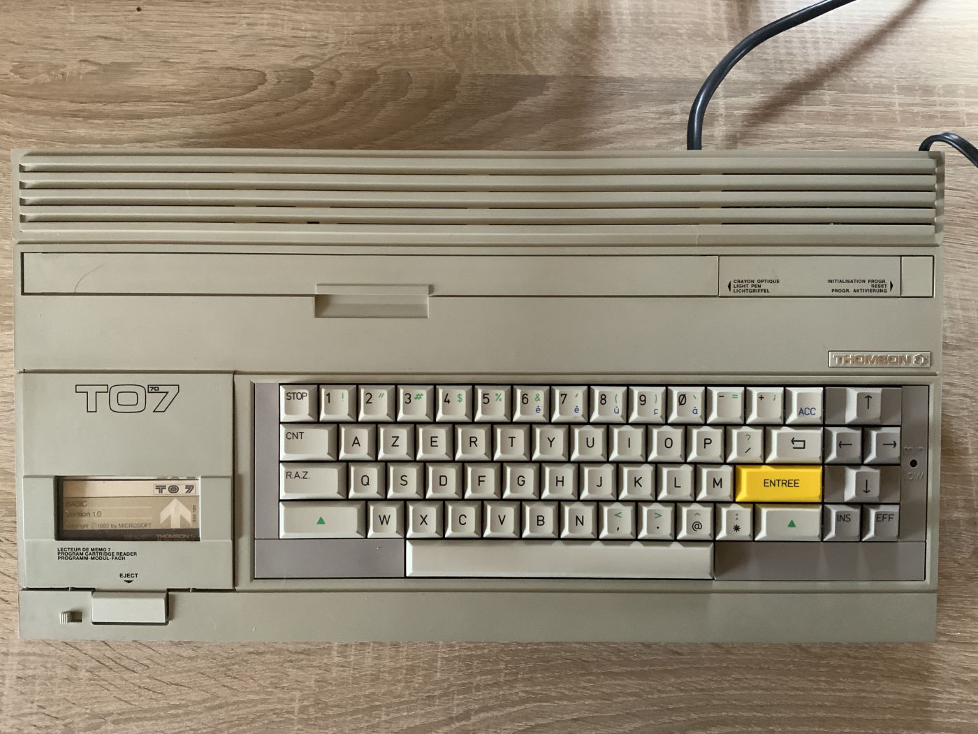 Mit den ersten beiden TO7-70, die ich erhielt, hatte ich Pech. Der erste bot kein sauberes Bild per Composite (und später gab das Netzteil Rauchzeichen von sich) und der zweite Rechner hatte gar keine Bildausgabe. Mit dem dritten Rechner hatte ich endlich Glück – französische Version mit Scart-Anschluss.