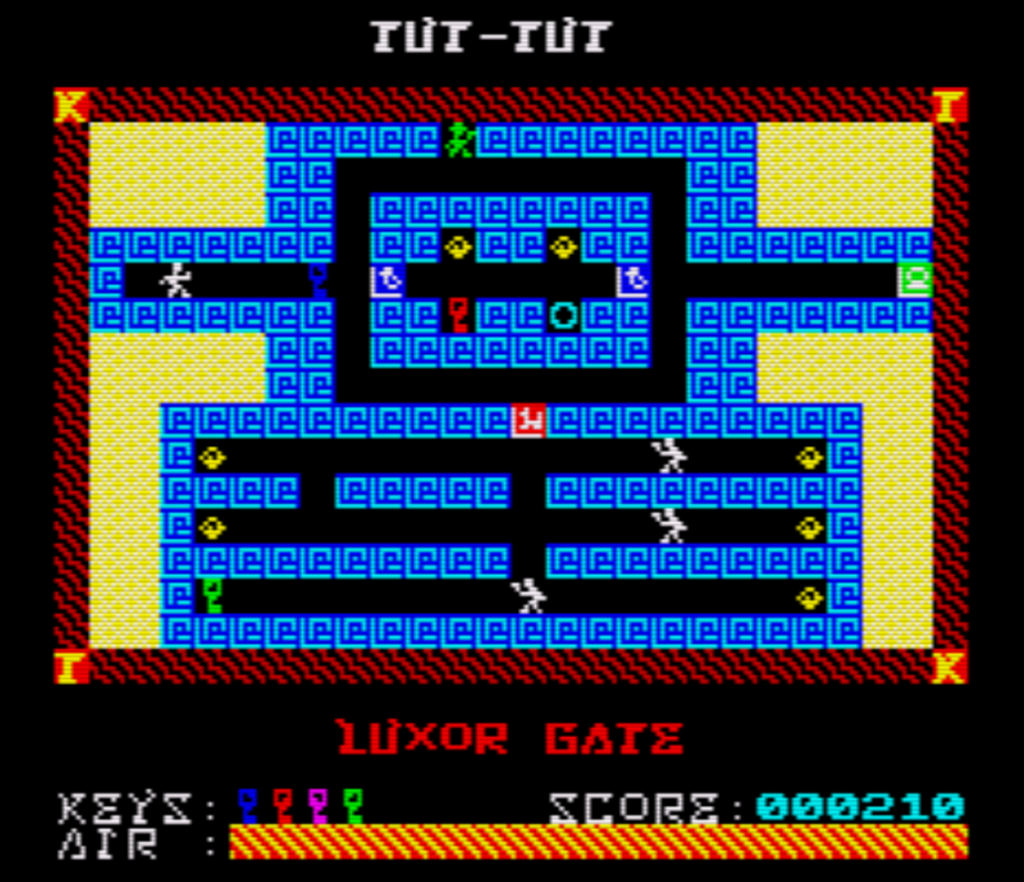 Tut-Tut ist ein Puzzle, das aus 15 Levels besteht. Um jedes Labyrinth zu bewältigen, müssen die verschiedenen Schlüssel eingesammelt werden, mit denen Türen geöffnet werden können (Farbe der Schlüssel beachten), es gilt Blöcke zu verschieben und den Ausgang finden, der dann zum nächsten Labyrinth führt. Die Schwierigkeit besteht jedoch nicht nur darin, die richtige Reihenfolge für das Einsammeln der Schlüssel oder die Orte zu finden, an die die Blöcke verschoben werden müssen. Überall im Labyrinth gibt es Wächter, die einen zum Ausgangspunkt zurückbringen, wenn sie berührt werden, nur jetzt mit weniger Sauerstoff. Ja, es gibt ein Zeitlimit für jedes Level, das durch den Sauerstoffbalken dargestellt wird, der mit fortschreitender Zeit abnimmt.