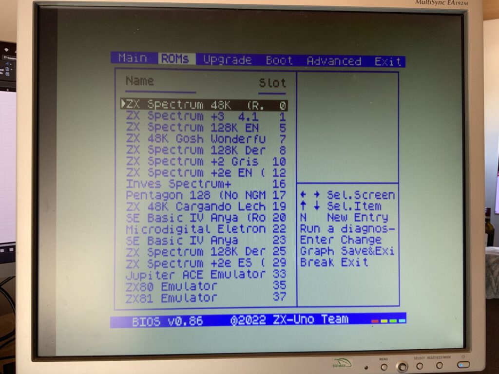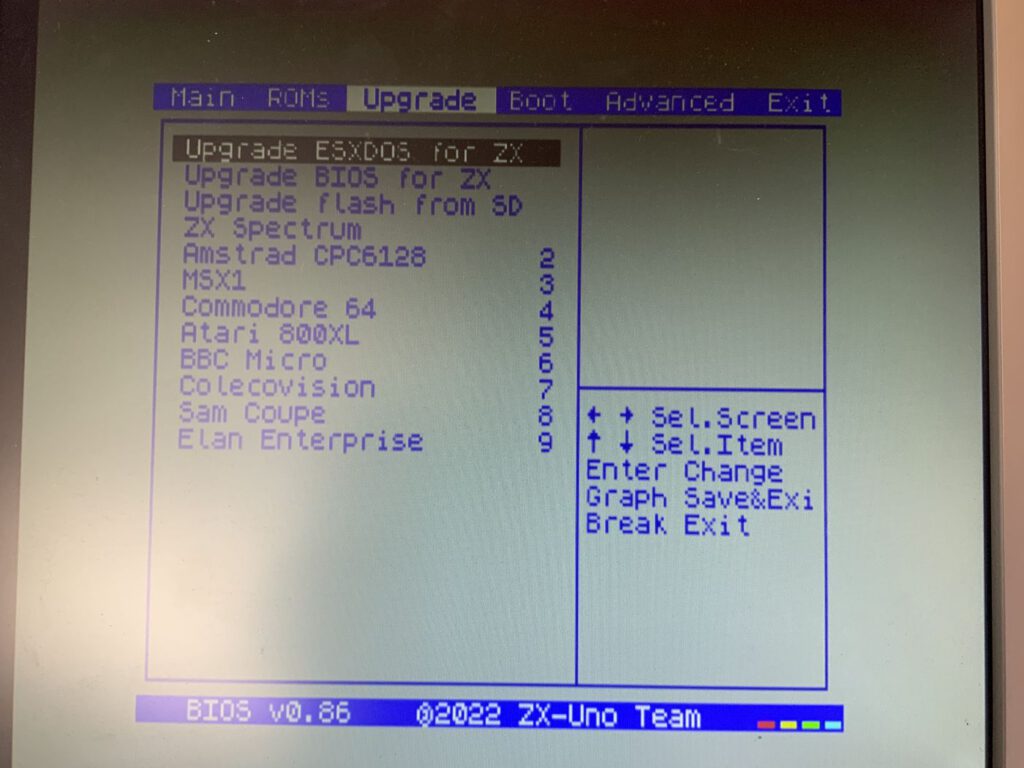 Das BIOS wurde auf 0.86 aktualisiert. Damit kann im ZX Spectrum Core der Joystick-Splitter aktiviert werden. Damit ist es möglich, zwei DB9-Anschlüsse mit dem ZX Uno zu verwenden.