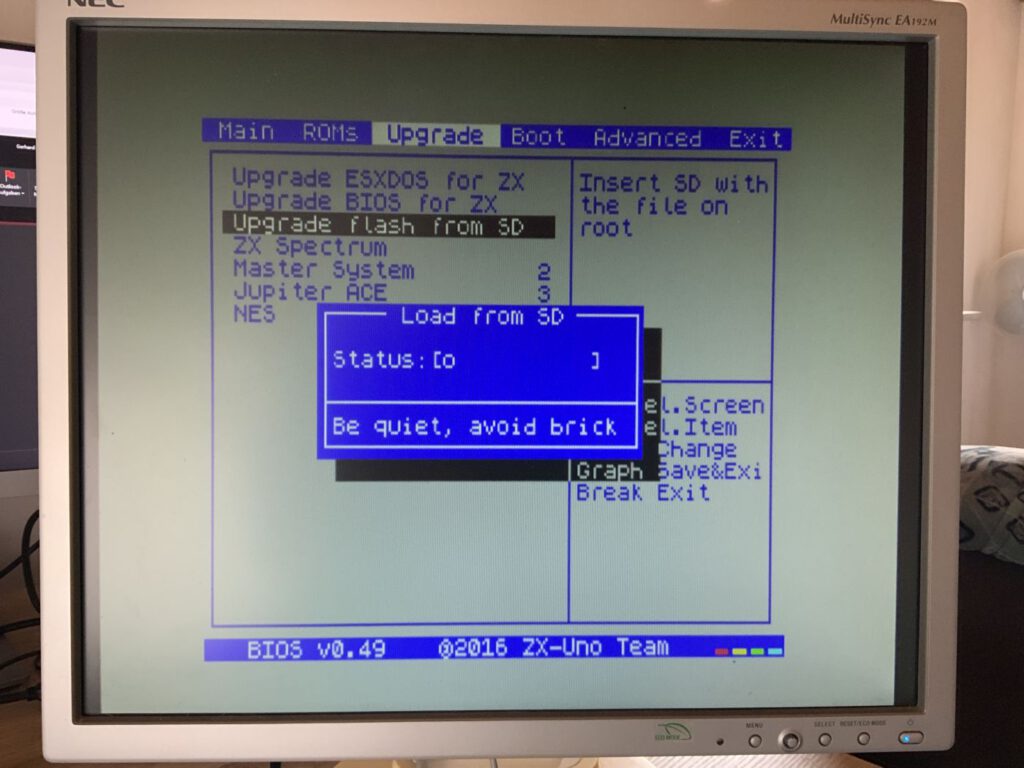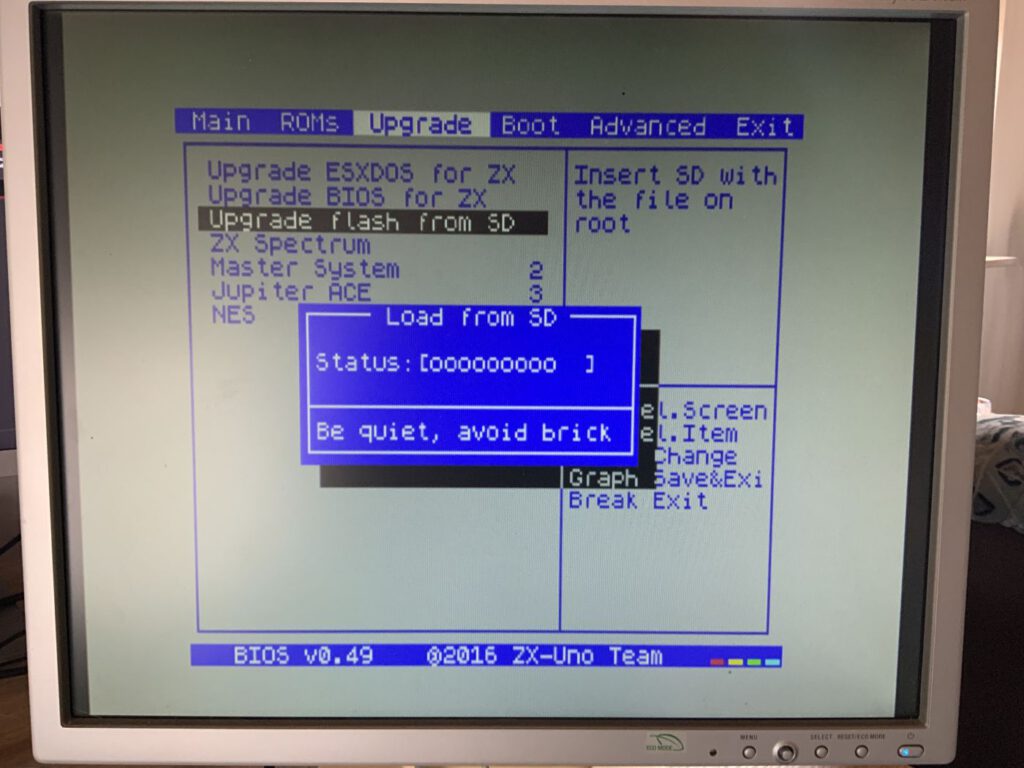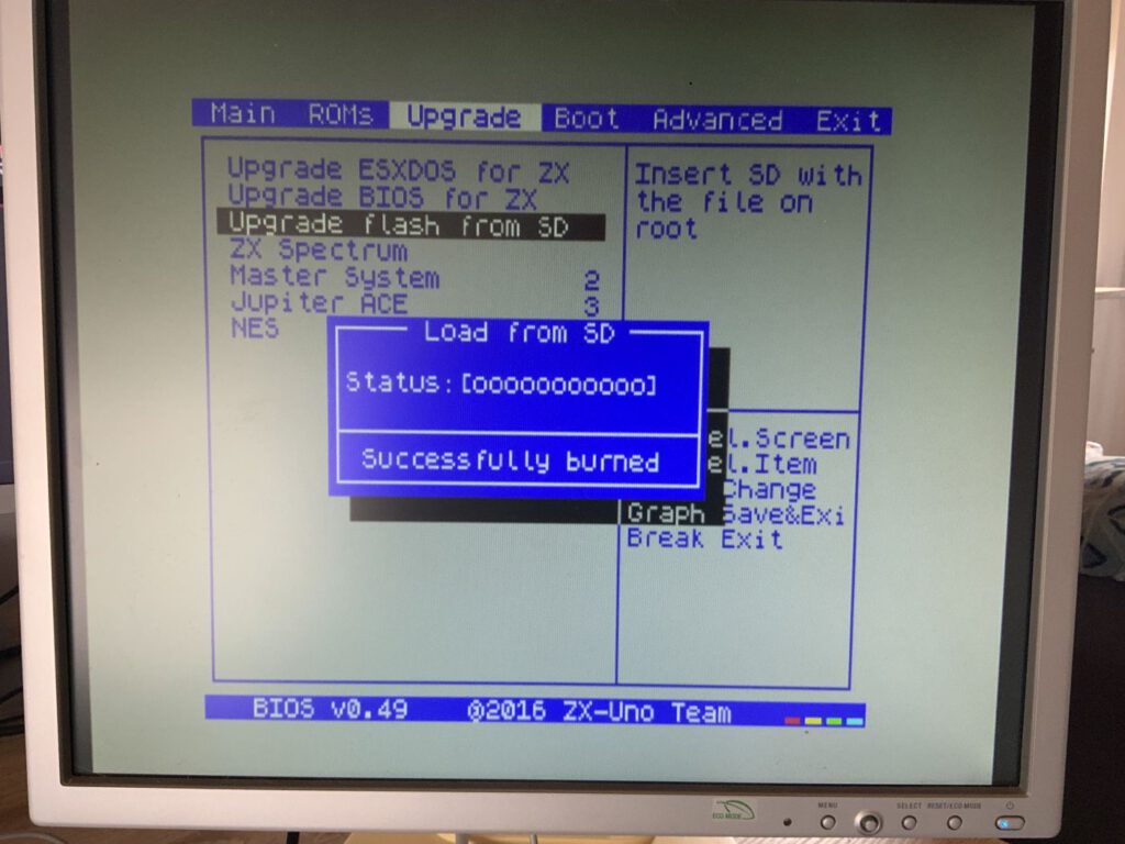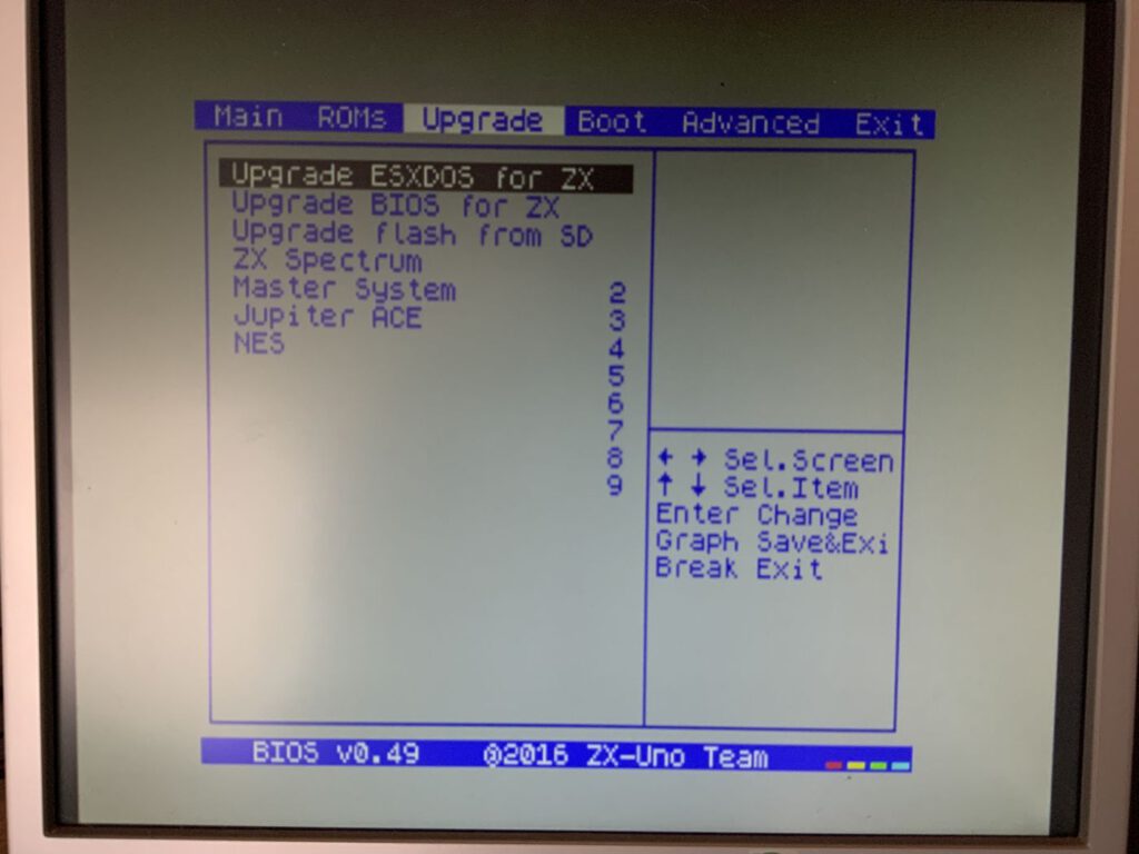 Die Dateien entpacken, auf die SD-Karte kopieren und aus dem Menü Upgrade die Option Flash von SD aktualisieren. Wenn die Aktualisierung abgeschlossen ist, muss der ZX-Uno ausgeschaltet werden!! Nicht über das BIOS mit Exit und Save Changes!!