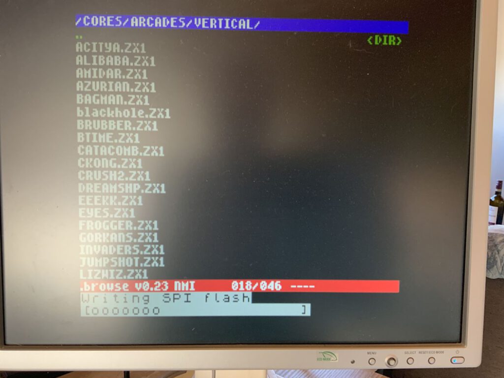 Damit die Cores mit dem alternativen NMI Browser von Bob Fossil verwendet werden können, muss ein gerooteter Spectrum Core gestartet werden. Dies ist möglich, indem beim Start des ZX-Uno die Taste / auf dem Ziffernblock gedrückt wird – der Rand wird Rot.