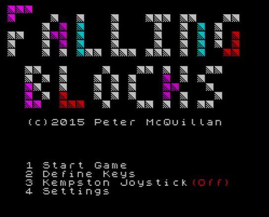 In Falling Blocks ist es das Ziel eine horizontale Linie von zehn Einheiten ohne Lücken zu bilden um einen High Score zu erreichen. Je mehr Linien erstellt werden, desto höher ist die Punktzahl die man erhält. Jeder Block des Puzzles kann seitlich bewegt und um 90 Grad rotiert und dann in die Lücken fallen gelassen werden. Wenn eine Linie erstellt wird, verschwindet diese! Wenn du das nicht schaffst wachsen die Linien langsam zum oberen Bildschirmrand bis sie diesen erreichen – dann endet das Spiel.