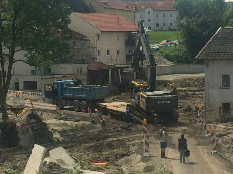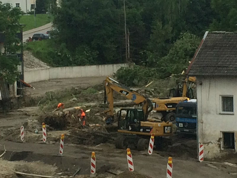 Als das Wasser abgeflossen war, konnte man das ganze Ausmaß der Zerstörung erkennen. 500 betroffene Häuser, wovon sicher einige abgerissen werden müssen, da sie nicht mehr sicher genug sind. Von den vielen Einzelschicksalen, die zum Teil nicht mal mehr eine Unterhose haben, will ich gar nicht reden. Die Strom- und Wasserversorgung ist auch nach einer Woche noch stark eingeschränkt. Dank des THW sind drei Trinkwasseraufbereitungsanlagen in Simbach, so das dieses Problem einigermaßen erträglich ist.