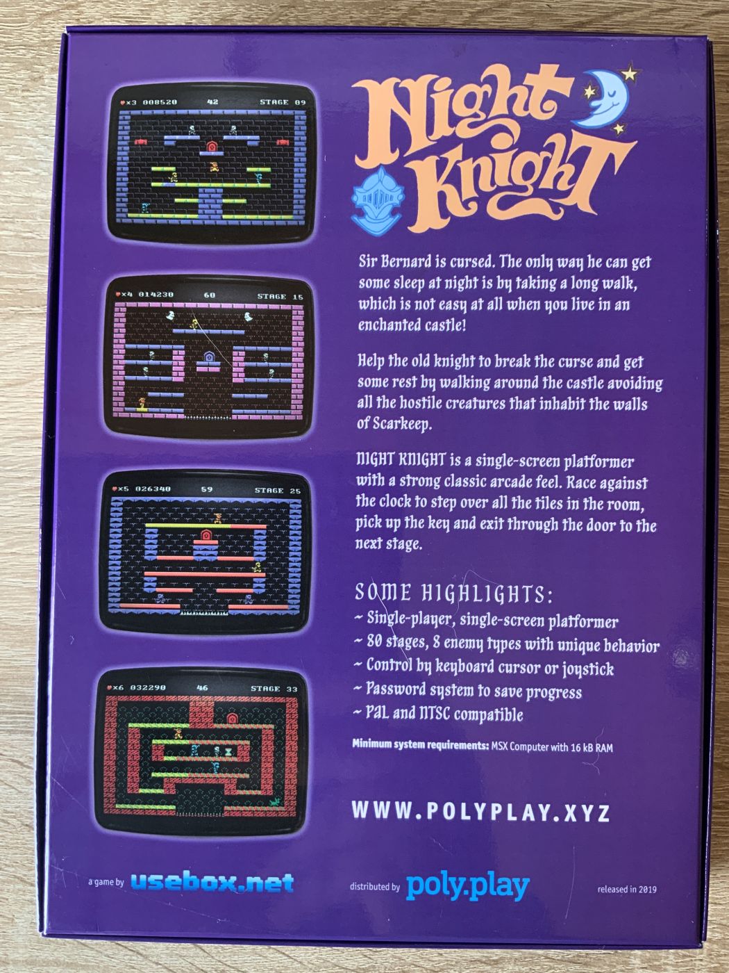 „Night Knight“ ist das neueste Spiel für die MSX-Plattform in meiner Sammlung. Wegen meiner Wertschätzung für die Qualität der Veröffentlichungen von Polyplay aus Deutschland, habe ich das Modul dort bestellt. Im Jahr 2024 erschien eine Version für den Sinclair Spectrum NEXT.
