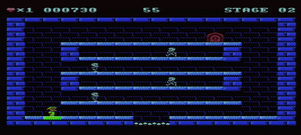 Wie bereits erwähnt, ist es dem Helden nur möglich, auf die oberen Plattformen zu springen. Um die unteren zu erreichen, muss er an bestimmten Stellen abspringen und seine Flugrichtung ändern.