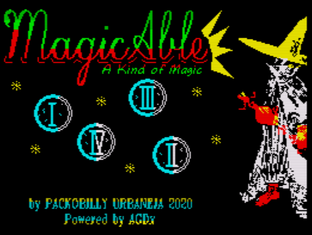 Der Autor Packobilly hatte uns vor kurzem Ufo auf die Bildschirme gebracht, ein durchschnittliches Spiel, das aber zeigte, dass es einen neuen Entwickler mit neuen Ideen gibt und den Arcade Game Designer beherrscht. MagicAble: A Kind of Magic ist sehr interessant, wenn auch genauso schwierig oder sogar noch schwieriger als Abu Simbel Profanation, und kommt sogar Danterrifik näher, einem Spiel, mit dem es auch auf grafischer Ebene einige Ähnlichkeiten aufweist.