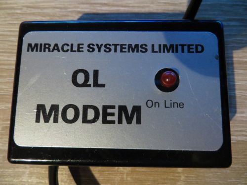 Dieses Modem für den Sinclair QL wurde von Miracle System hergestellt. Das kleine externe Modem schaffte 1200/75 Baud im Betrieb bzw. 1200/1200 Baud Half-Duplex – zum Vergleich: heutiges Gigabit Ethernet hat eine Symbolrate (= Baud – nach Emile Baudot) von 125 MBaud. In einer kleinen schwarzen Box untergebracht, hatte es ein Meter langes Kabel zum Anschluss an den QL und ein Status LED – auf der anderen Seit der Box war das Kabel zum Anschluss an das Telefonnetz.. Es wird an SER2 am QL angeschlossen und wurde in den 80er verwendet, als Bulletin Boards noch bekannter waren als das in den Kinderschuhen steckende Internet.