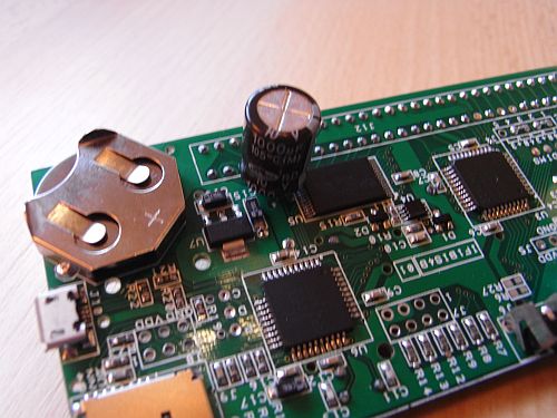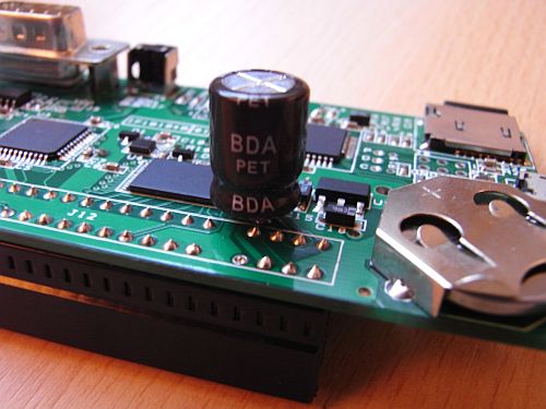 Der empfohlene Wert reicht von 100 µF bis 100µF bei einer Spannung von 6,3 bis 50 Volt. Die Bauhöhe kann 2,5 – 3,5 mm betragen wobei maximale Arbeitstemperatur egal ist. Für das beste Ergebnis sollte die Lötmaske auf beiden Seiten des Boards abgekratzt und genügend Lötzinn verwendet werden um die Löcher zu füllen.