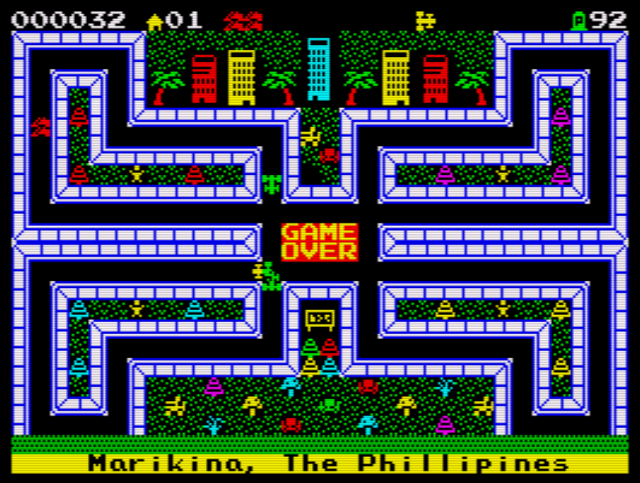 Die Schauplätze sind labyrinthisch, und in den fortgeschrittenen Levels gibt es sogar einige Fallen, wie z. B. Schilder, die die Straßen sperren und denen ausgewichen werden muss. Natürlich verbraucht das Fahrzeug Treibstoff, also muss der Füllstand beachtet werden (er beginnt bei 99 und bei 0 ist ein weiteres Leben weg).