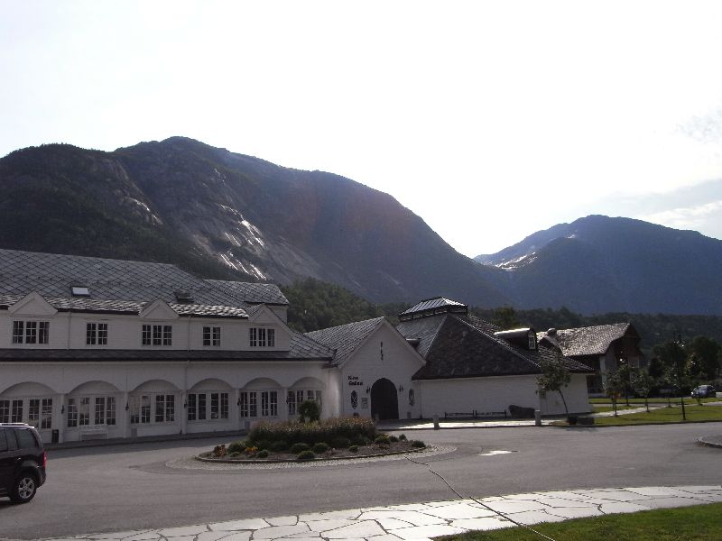 Dieser Tag war mit einer längeren Strecke verbunden: ca. 300 km. Daher brachen wir etwas früher als gewöhnlich auf. Wieder geht es durch landschaftlich absolut traumhafte Gegenden – die ersten 90 km führen über die Hochebene Hardangervidda bis zum Wintersportort Geilo. Weiter geht es nach Aurland – kurz bevor wir es erreichen wird das Wetter schlechter und wir vermeiden gerade noch ein ziemliches Unwetter, dass wir vom Ort aus beobachten können. Da das Wetter nicht so einladend war, sind wir nicht über die alte Passstraße nach Laerdal gefahren, sondern durch das längste Straßentunnel der Welt (25 km). Wegen der Länge des Tunnels wurden mehrere Parkbuchten mit blauer Beleuchtung eingerichtet. Das nächste Ziel war Fodnes, wo wir die Fähre nach Manheller nahmen. 30 km später erreichten wir in Sogndal das Best Western Laegreid Hotel. Leider war das nette Hotel im Zentrum, so dass wir dieses Mal keine Aussicht geniessen konnten. Dafür konnten wir aber im Hinterhof die Bikes parken. Das Hotel war sehr gemütlich eingerichtet und das reichhaltige Buffet war in Ordnung. Später schloss sich uns dann auch der verlorene Sohn „Pezi“ wieder an, dessen Bike wieder fahrtüchtig war.
