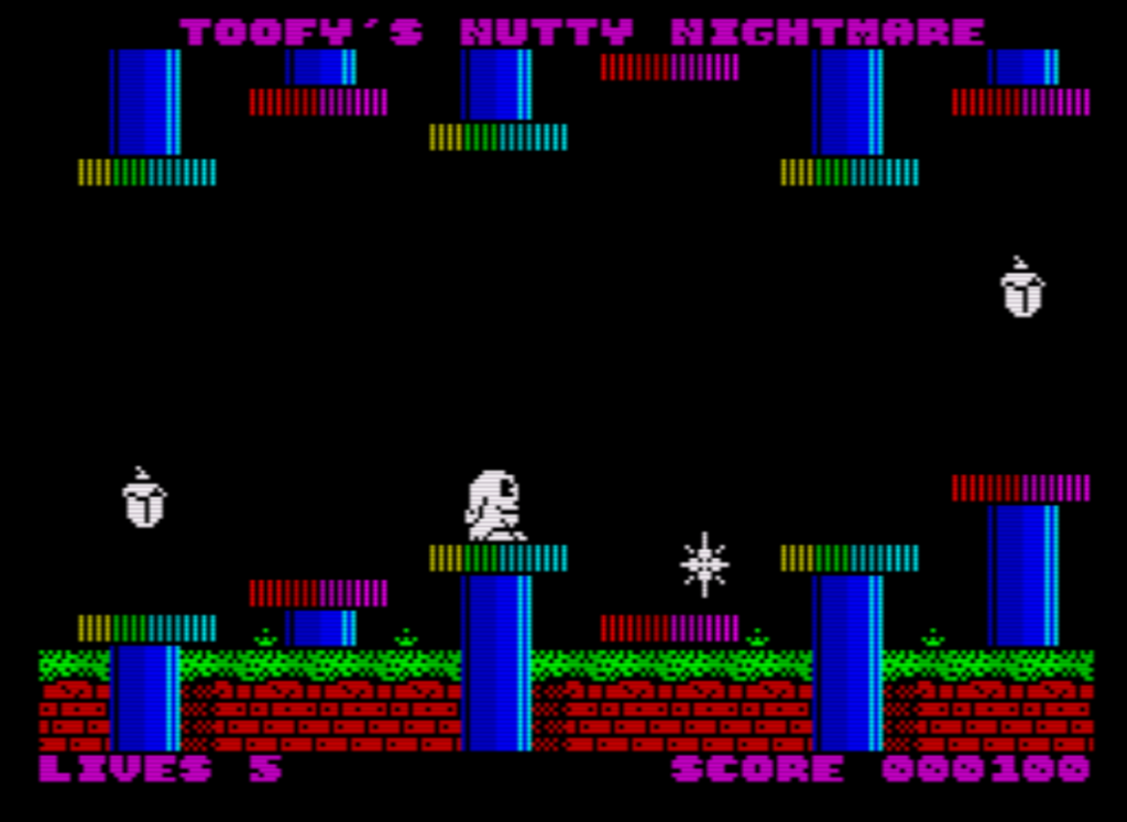 Da Toofy’s Nutty Nightmare ursprünglich auf dem Vega+ erscheinen sollte, sind die Bildschirme etwas kleiner als üblich für Spectrum-Spiele. Da jedoch fast nur ein kleiner Streifen mit dem Namen und ein etwas größerer mit den verfügbaren Leben und dem Punktestand (jede Nuss ist 100 Punkte wert) verwendet wird, ist die Aktionsfläche noch größer als bei den meisten Spielen, was in diesem Fall sehr praktisch ist, denn wenn Objekte von oben fallen, braucht man Platz und Zeit, um reagieren zu können. Paul gelang es, dieses Problem mit vollem Erfolg zu lösen, was zu einem hervorragenden Gameplay beitrug.