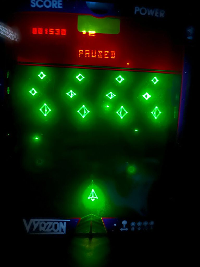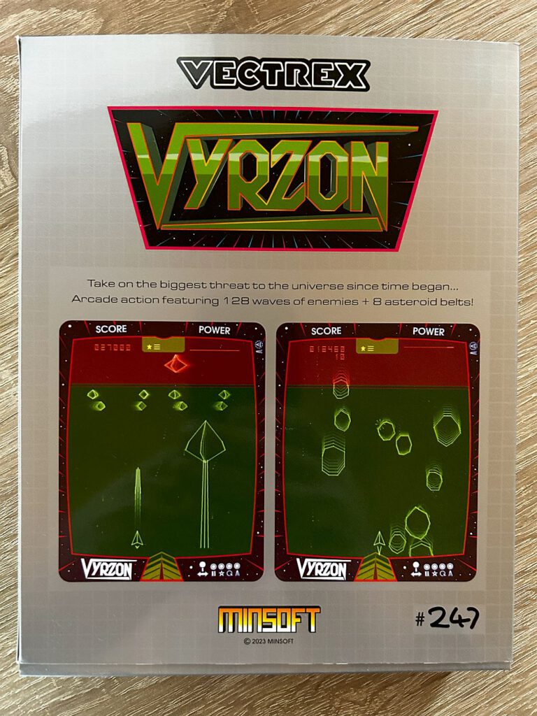 Vyrzon von Minsoft ist der nächste Knaller für die Vectrex! Dabei handelt es sich um ein Shoot’Em’Up mit Einflüssen von Space Invaders (vor allem was die Soundeffekte betrifft), aber das Gameplay ist sehr eigenständig. Das Spiel wird in der physischen Form von Minsoft selbst vertrieben und steht immer wieder in Batches zum Kauf zur Verfügung. Die Produktion ist hochwertig und wird mit Box, Cartridge, Overlay und Anleitung ausgeliefert. Der Preis beträgt 70 Pfund zzgl. Versandkosten.